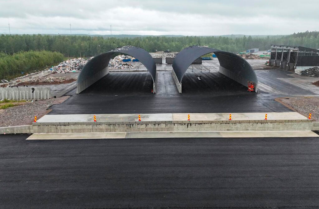 “Meille rakennettiin kaksi samanlaista hallia, jotka sijoitettiin vierekkäin. Hallit ovat molemmista päistä auki – toisesta päästä jätekuorma puretaan ja toisesta jätettä lastataan koneella kontteihin”, Ruuska kuvailee.